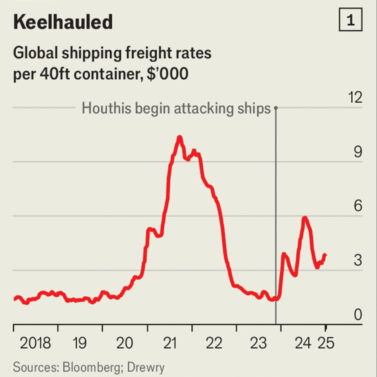 Throughout 2024 the Houthis forced ships to divert around Africa. Journeys from Asia have lengthened by 3,000-3,500 nautical miles (6,000km), or 10-14 days. Containers are lost to the choppy southern waters. Longer transits at faster speeds burn more fuel, adding $1m in costs per voyage, according to an American-intelligence brief. Still, that is cheaper than using the Red Sea, where insurance prices have shot up 20-fold, says Thomas Nordberg, of The Swedish Club, an insurer.