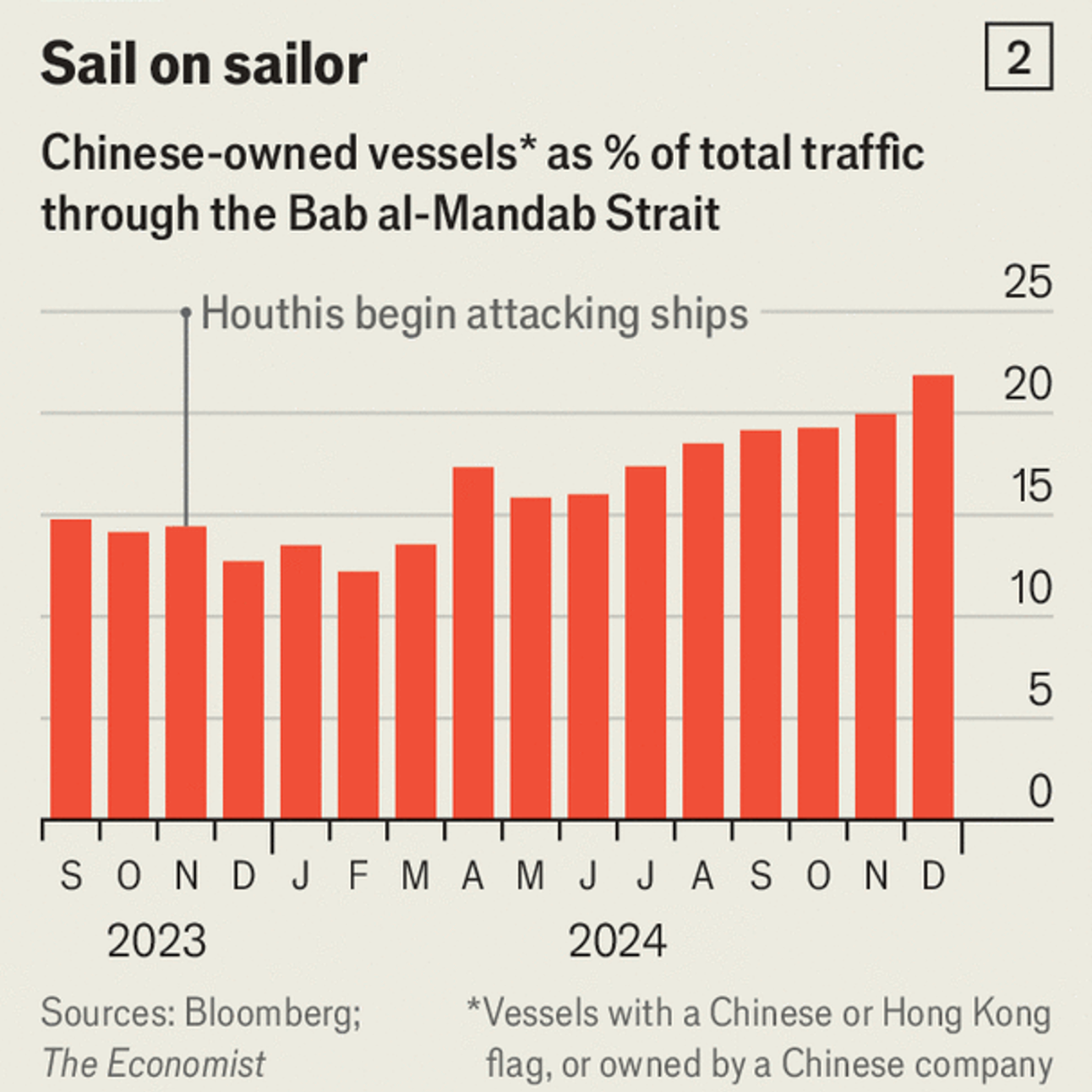 To get a sense of how the Houthis operate The Economist has interviewed two dozen participants in the Red Sea drama including representatives of the militia, naval officers, insurers, shipping firms and diplomats. We have also analysed satellite-tracking data and vessel ownership records. The picture that emerges is one of dramatic change. Cargo volumes in the strait have fallen by two-thirds, the ultimate nationality of vessels has shifted, container routes have been redrawn and the costs to the global economy amounted to some $200bn in 2024. The other finding is that the Houthis are surprisingly sophisticated, are exploring new weapons technology—and are in it for the long run.