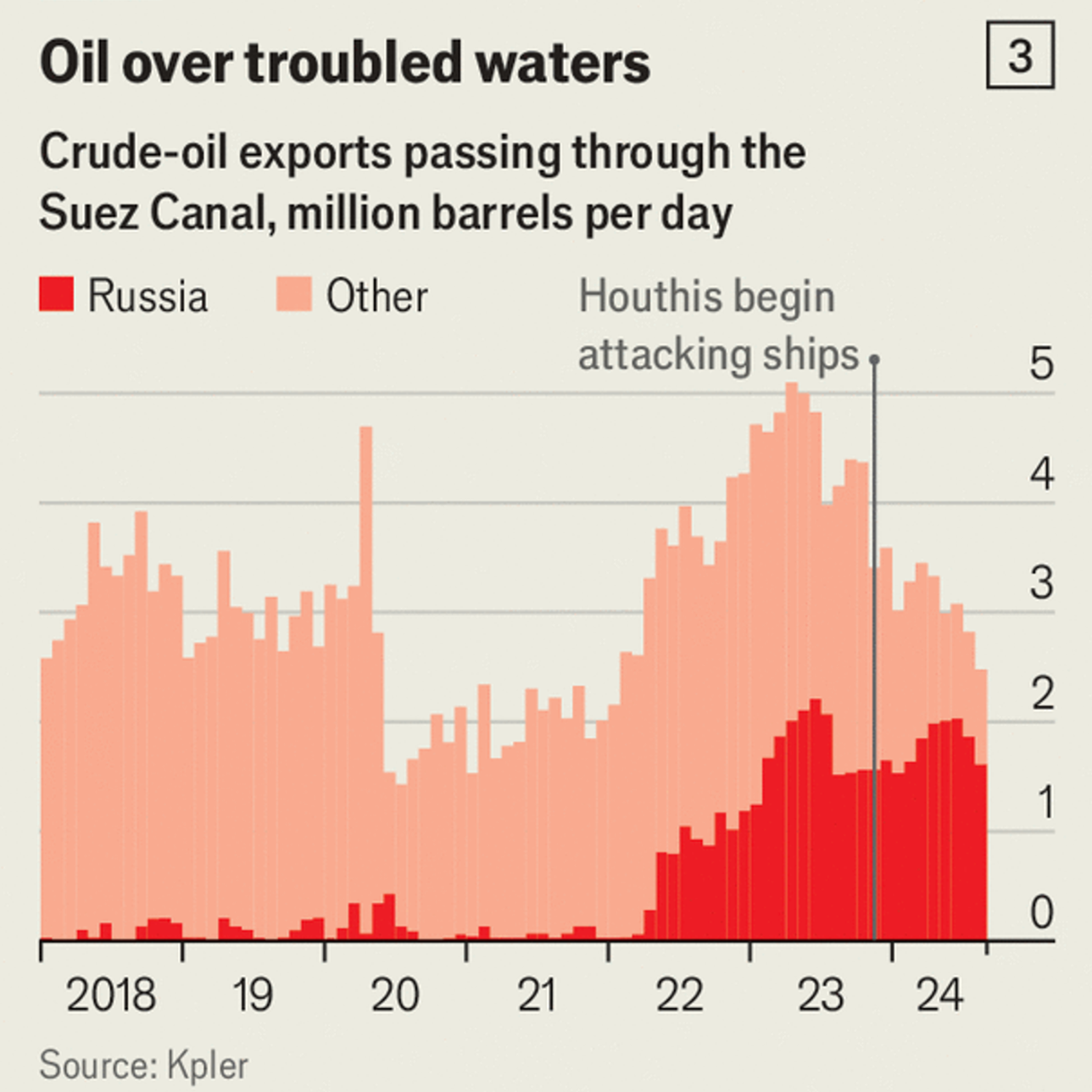 Some firms and countries are benefiting. Though the number of ships going through the strait has fallen by half, Chinese transits have increased and now make up a fifth of the 800-900 ships still transiting the Red Sea each month, according to an analysis of satellite data and ownership records (see chart 2). Most of the crude oil going through the Suez Canal is Russian, up from less than half (see chart 3).