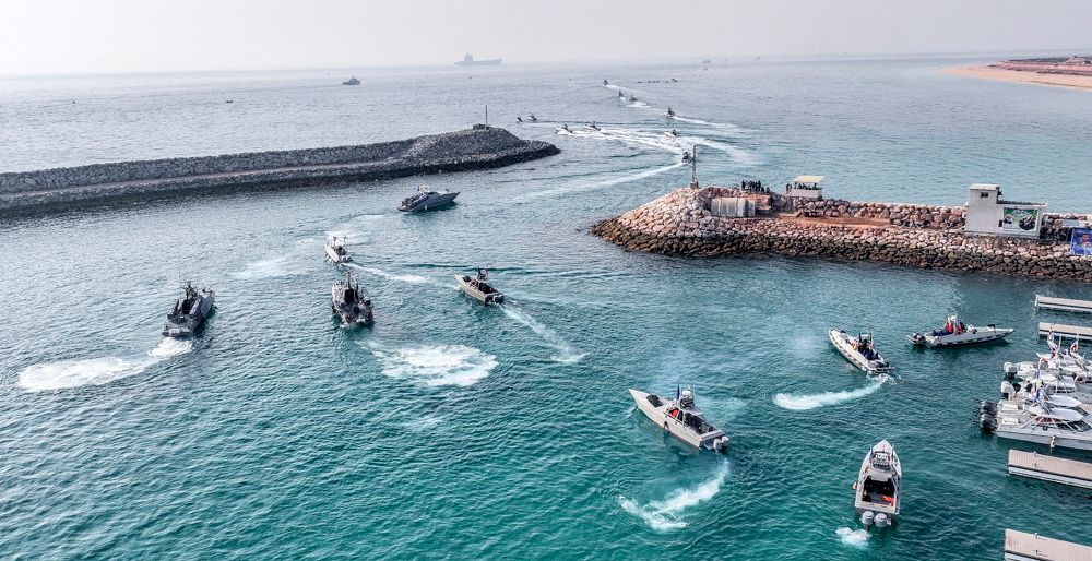 Snabbåtar från Revolutionsgardet i Hormuzsundet vid övning 2023. Iran har undertecknat men ej ratificerat FN:s havsrättskonvention. (AP)