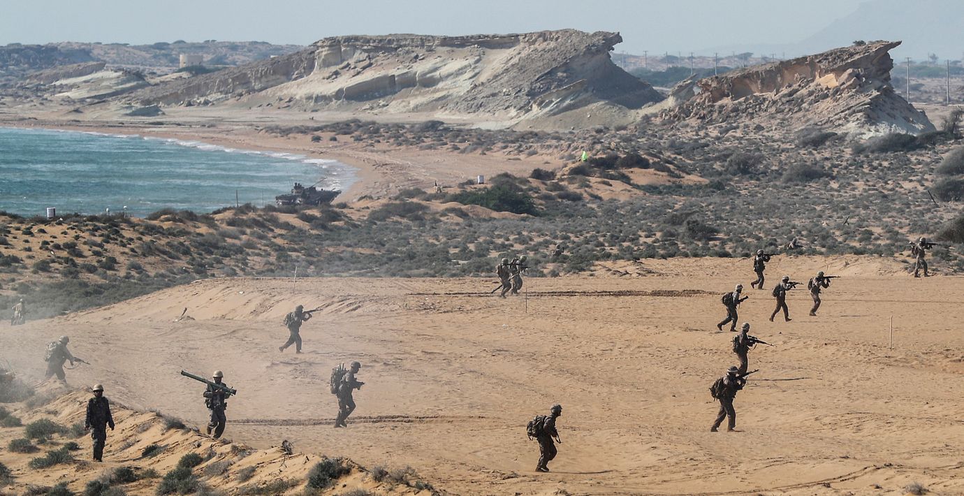 Revolutionsgardet på ön Qeshm i Hormuzsundet 2018. Strypsnaran är delvis ekonomisk – försäkringspremien behöver bara tvingas upp till några procent av fraktvärdet för att en passage ska bli en förlustaffär för rederierna som då avbryter transporterna. (Hamed Malekpour / AP)