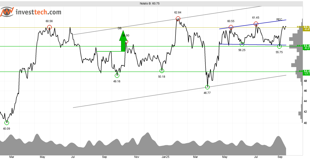 Nolato som är verksamt inom tillverkningsindustrin med bland annat tillverkning och distribution av plastkomponenter ser tekniskt och kvantitativt stark ut. Aktiekursen till bolaget har haft en sidledes utveckling under de senaste 4-5 månaderna inom en stigande trendkanal som Investtechs algoritmer har identifierat på kursdiagrammet för medellång sikt.