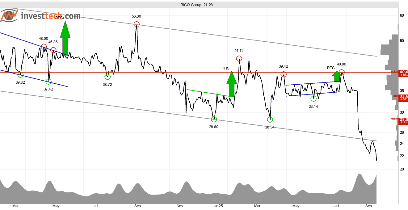Bico Group (tidigare Cellink) som är verksamt inom bioteknikbranschen ser ur ett tekniskt perspektiv negativ ut. Under en längre period utvecklades aktiekursen sidledes men bröt i augusti ned genom stödnivån runt 33,60 kronor som därmed ombildades till en ny motståndsnivå. Kursraset har fortsatt och bara den senaste månaden är aktiekursen ned med mer än 39 procent. Aktiekursen har även brutit ned genom den starka stödnivån vid 28,50 kronor samt trendgolvet i den fallande trendkanalen som Investtechs algoritmer har identifierat på kursdiagrammet för medellång sikt.