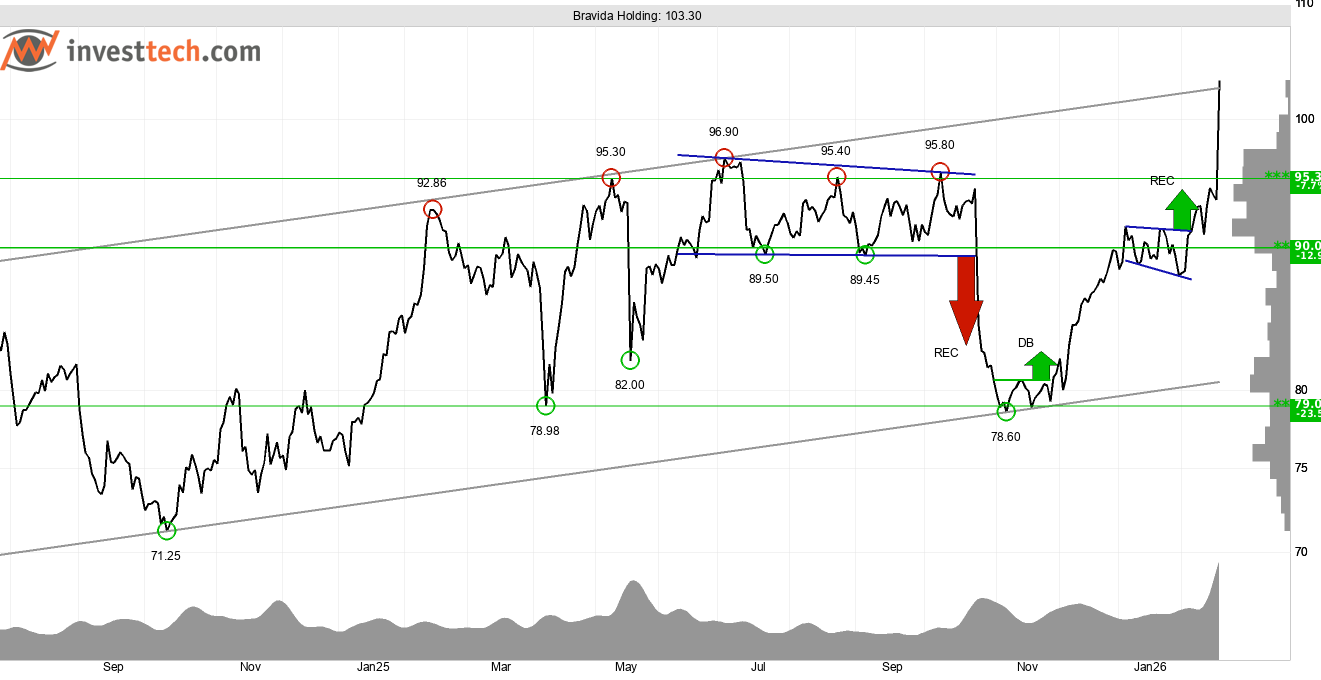 Bravida Holding steg 10,3 procent på rapporten under onsdagen (18/2). Detta gjorde att motstånden runt 95-97 kronor bröts och köpsignal utlöstes. Aktien testar taket i en rektangelformation i grafen på lång sikt. Fortsatt uppgång kommer utlösa ny köpsignal. Motstånd finns närmast vid 112 kronor i grafen på lång sikt. Aktien stärks av en positiv trend, en stark volymbalans, och ett starkt momentum. 95-97 kronor är stöd. Aktien är neutral på insiderhandel och tekniskt positiv på en medellång investeringshorisont (1-6 månader).