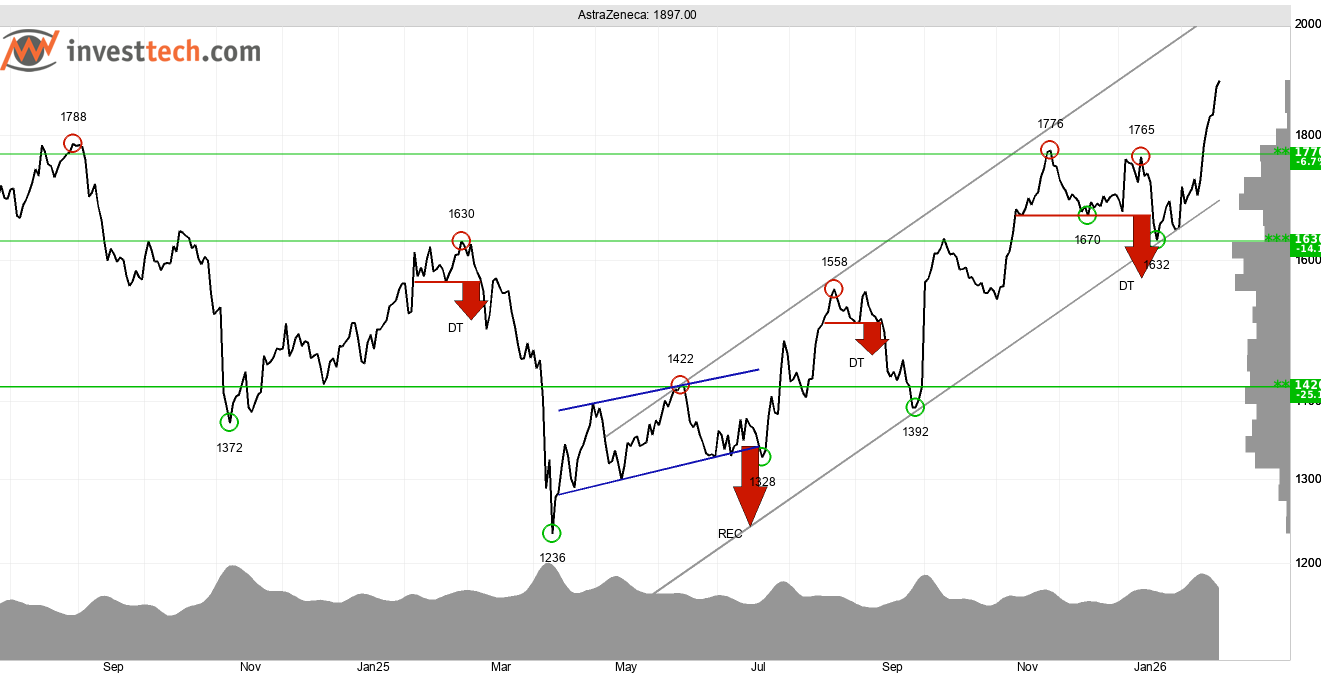 Läkemedelsbolaget Astra Zeneca uppvisar en mycket teknisk bild på medellång sikt (1-6 månaders investeringshorisont). En starkt stigande trend är resultatet av att investerare över tid köpt in sig till allt högre kurs. Senaste månaden har aktien klättrat tio procent och brutit upp genom motståndet vid 1 770 kronor, och handlades under onsdagen (18/2) till nytt all time high. Motstånd saknas därmed. 1 770 kronor är numer stöd. Ett starkt momentum ger stöd till fortsatt uppgång närmaste tiden. Astra Zeneca är neutral på insiderhandel och tekniskt positiv på medellång sikt.