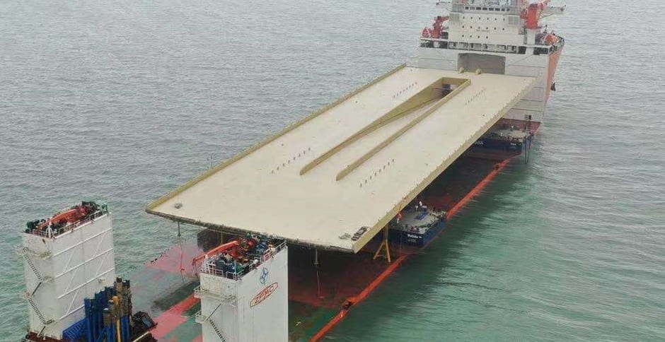 Huvudbron som ska gå över Slussen, som är guldfärgad och tillverkad i Kina, har nu påbörjat resan till Sverige.