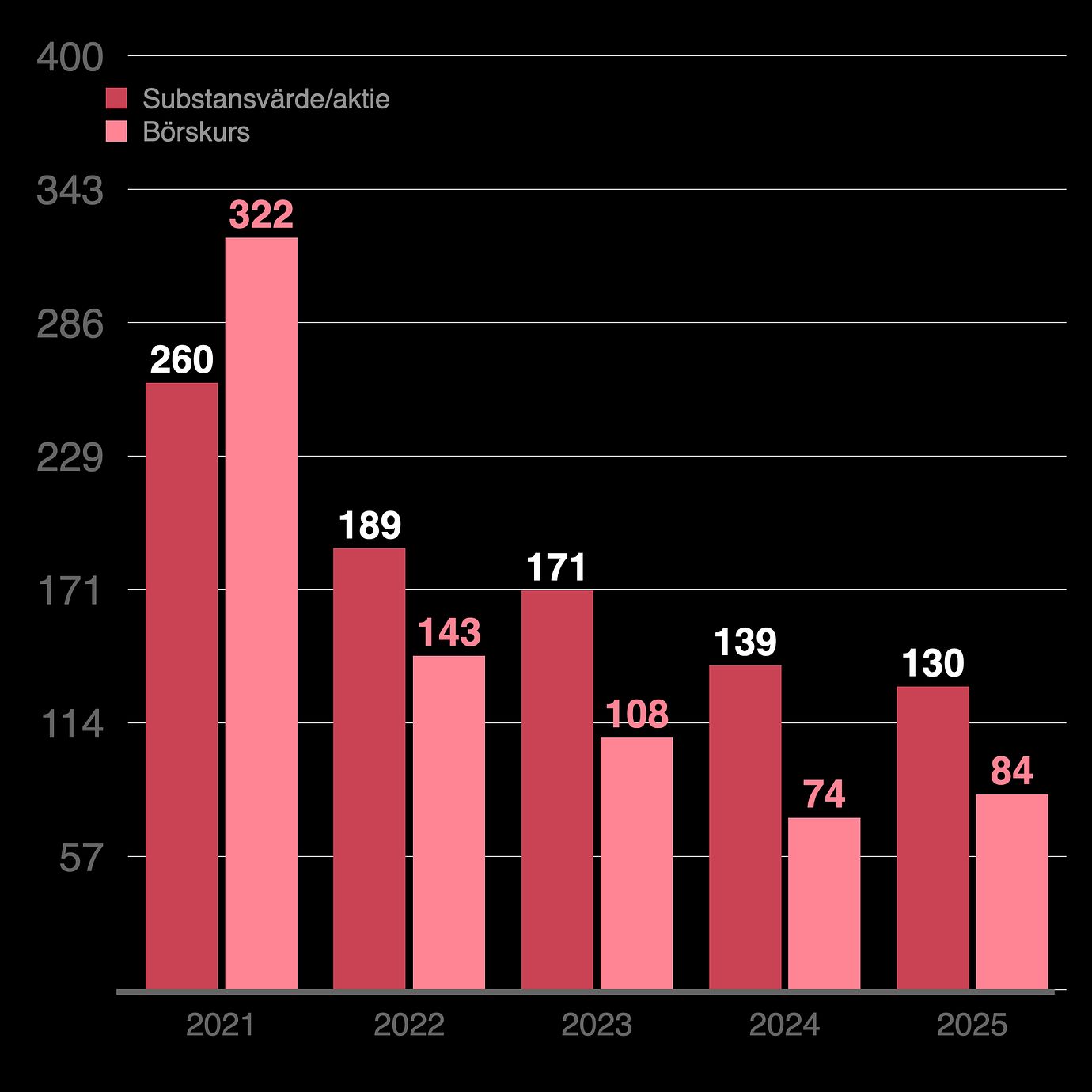 Kinneviks substansvärde per aktie och börskurs vid respektive årsskifte.