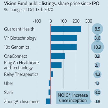 A hot market for technology initial public offerings (IPOS) will help. Since the fund’s inception nine of its firms have gone public. Prominent bets like Uber have disappointed. But all told, returns from the listings have been decent (see chart 2). And more IPOS are in the offing. DoorDash, a food-delivery firm, expects to list in November at a valuation of around $25bn. That would quintuple the value of Vision Fund’s $600m investment.