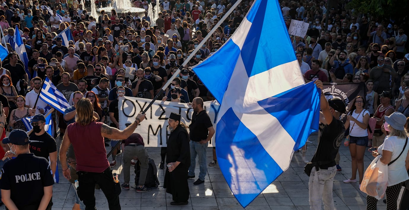Stora antivaccin-protester i Aten: ”Stick härifrån!”
