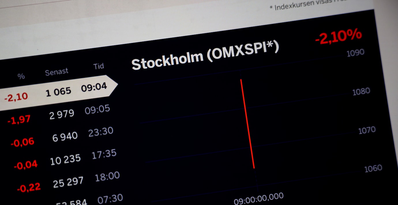 Efter nya handelshot från USA faller Stockholmsbörsen tydligt på måndagsförmiddagen. Vid 09.45 är båda ledande index ner runt 1,5 procent, med defensiva bolag mot strömmen.