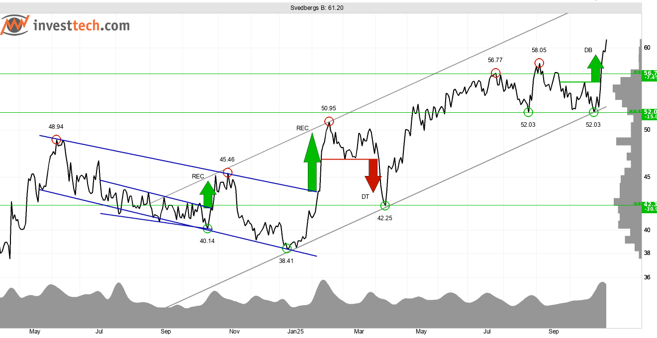 Nyligen identifierades även en köpsignal från en dubbelbotten-formation (DB) och aktien handlas nu till all time high vilket gör att det även saknas motstånd. Vid reaktioner nedåt har aktiekursen stöd vid cirka 56,70 kronor. Investtechs kvantitativa score är ett mått på hur god avkastning aktien beräknas ha i framtiden i förhållande till de andra aktierna på marknaden och just nu är Svedbergs helt i toppen med en score på 99,2 av 100.