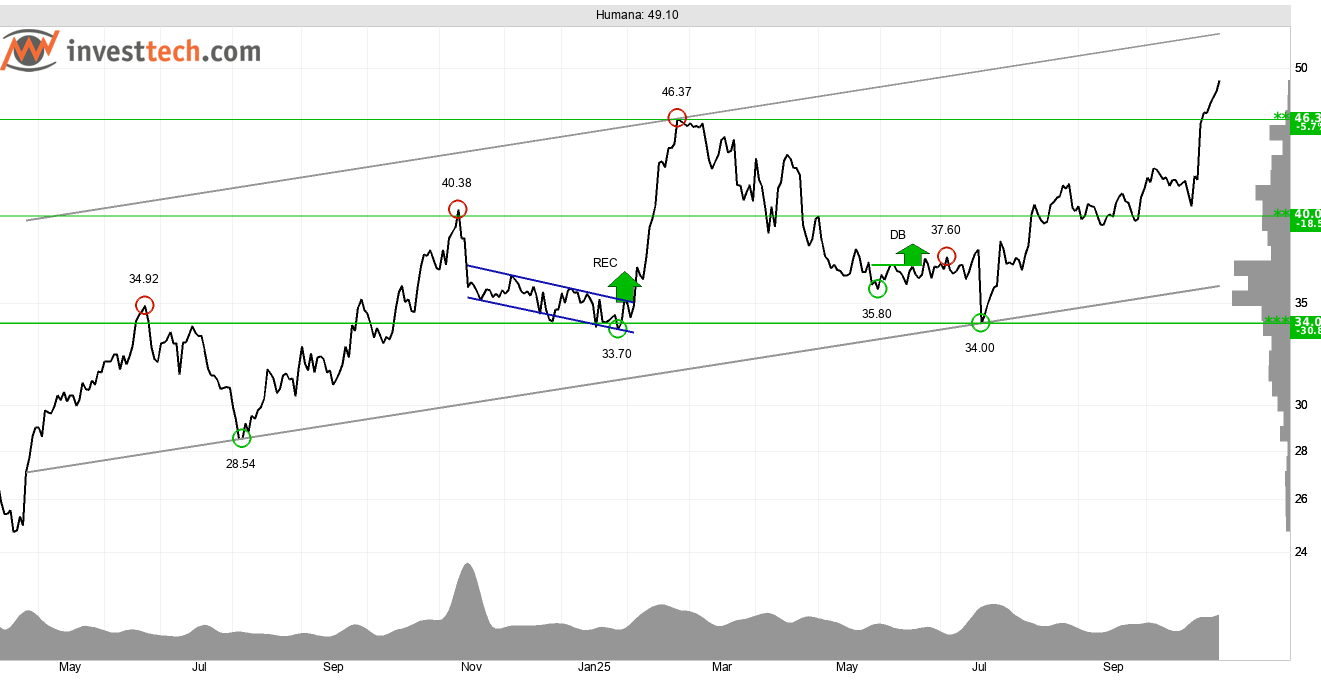 Om man är på jakt efter exponering mot hälsovårdssektorn så ser Humana med verksamhet inom vård- och omsorgssektorn ut som en bra kandidat. Marknaden tog väl till sig delårsrapporten som presenterades under förra veckan och aktien steg med hela 8,88 procent på rapportdagen. Rent tekniskt så utvecklas aktiekursen i en stigande trendkanal som Investtechs algoritmer har identifierat på kursdiagrammet för medellång sikt.