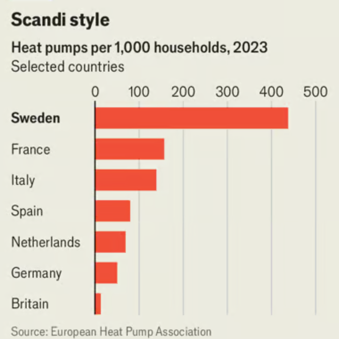 The industry still has plenty of room to expand. Martin Lewerth, Aira’s chief executive, notes that there are 130m boilers in Europe, and that every year between 7m and 9m of them break down. Although in chilly Sweden there are 438 heat pumps per 1,000 households, in France, Germany and Britain there are only 157, 50 and 13, respectively (see chart).