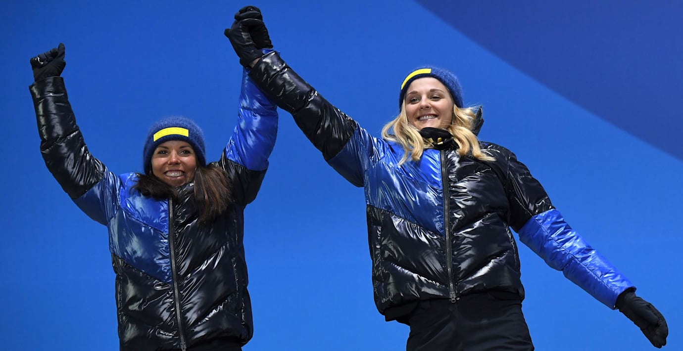 Silverteamet Charlotte Kalla och Stina Nilsson har nu tagit emot sina silvermedaljer efter sprintstafetten. Tillsammans, hand i hand och med stora leenden gick de upp på prispalle…