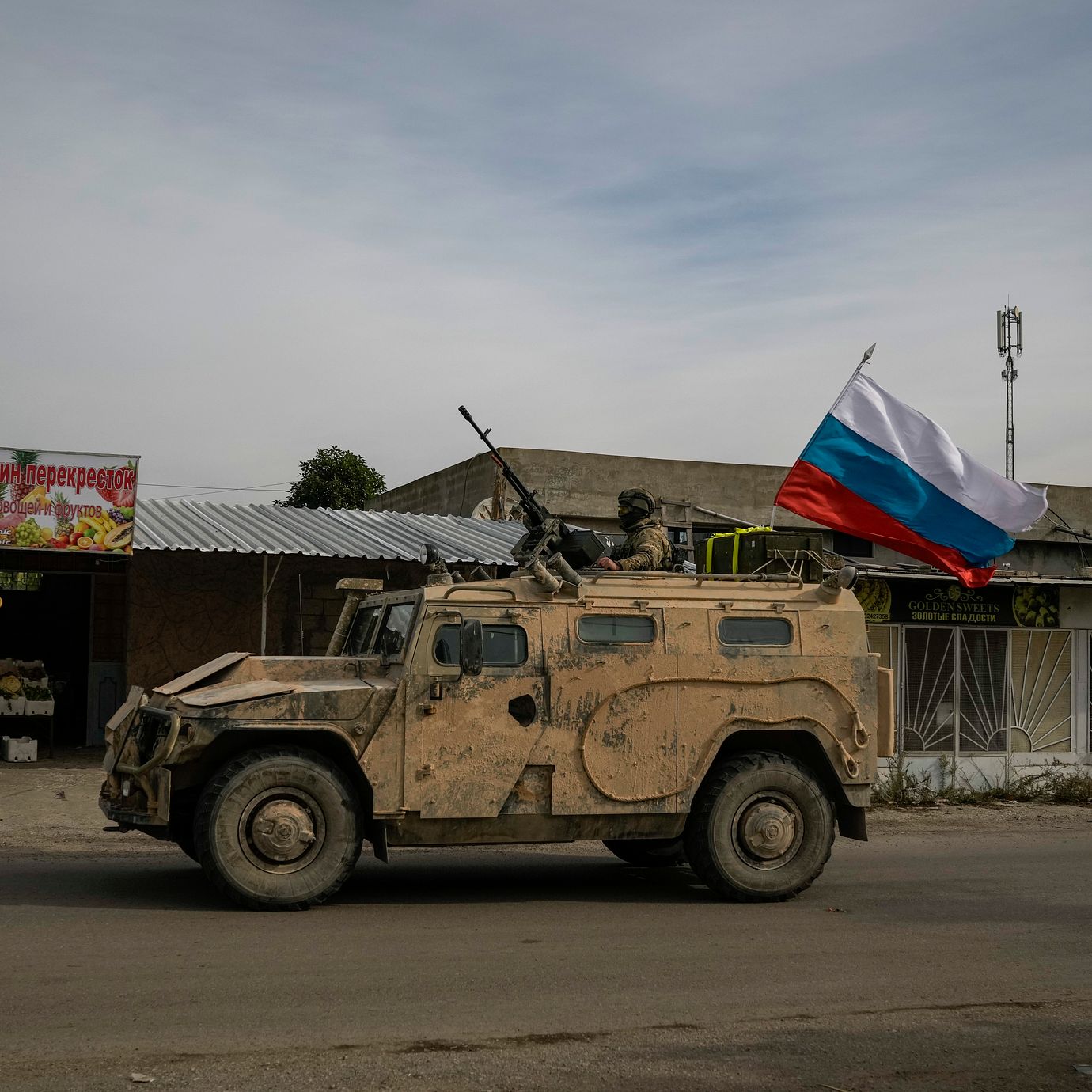 At the entrance to Khmeimim air base in western Syria, a portrait of Vladimir Putin keeps watch. A Russian soldier offers a salute to a convoy arriving from Homs. In recent days, the Kremlin has withdrawn hundreds of troops and military vehicles from other parts of Syria, in a mad scramble to consolidate forces at Khmeimim.