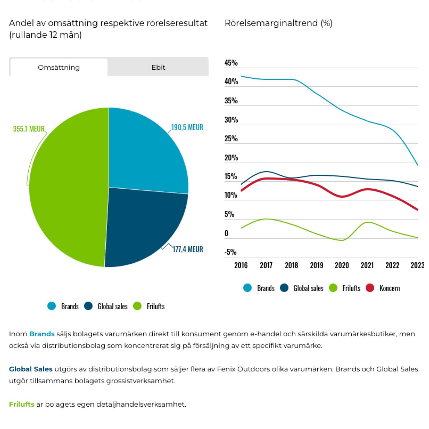Koncernen omsätter en bit över 700 miljoner euro och sysselsätter närmare 3 000 heltidsanställda. Utvecklingen har dock varit utmanande de senaste åren och under 2023 landade rörelsemarginalen på 7,4% vilket är bland de lägre siffrorna som Fenix Outdoor redovisat i modern tid.