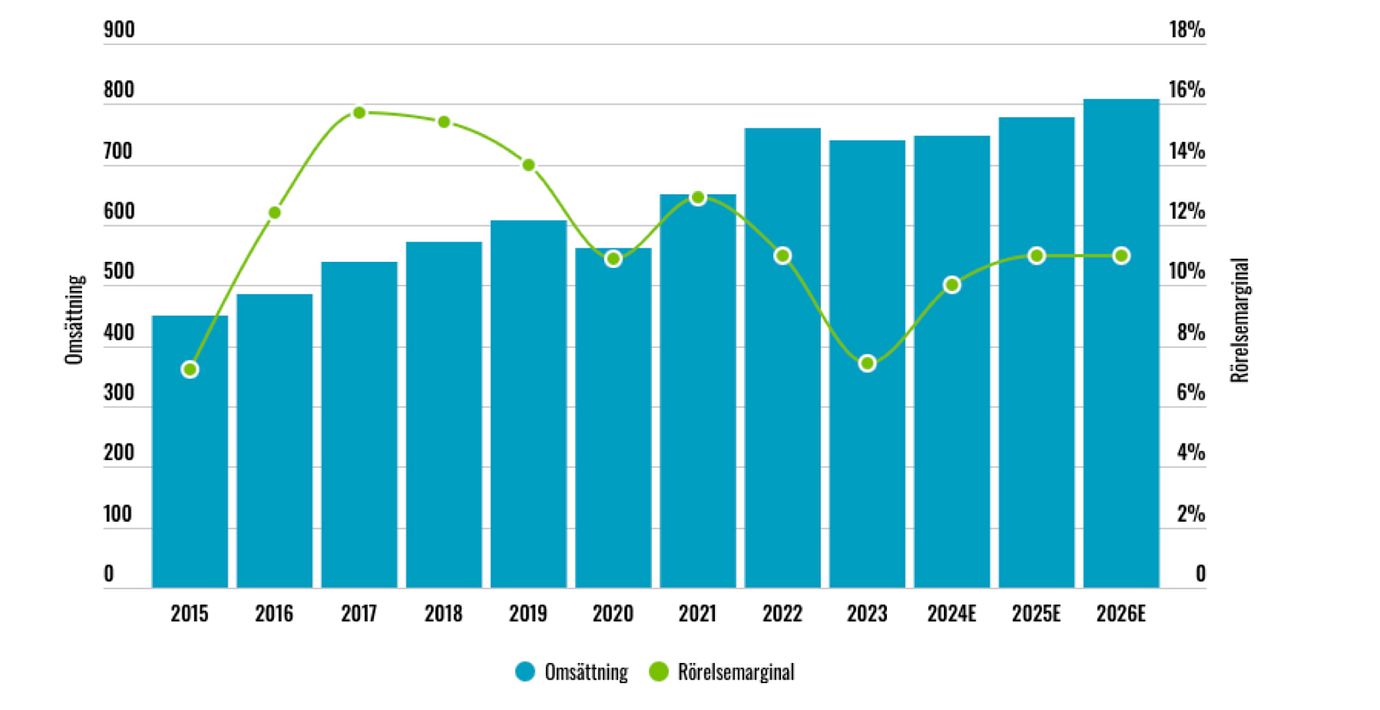 Under 2023 föll omsättningen med 3% medan rörelsemarginalen landade på 7,4%. Det kan jämföras med marginaler på mellan 11% och 16% under 2016-2022.