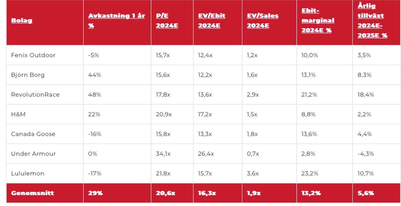 Fenix Outdoor har historiskt haft rörelsemarginaler kring 11-16% och en värdering runt 10-15 gånger rörelseresultatet (EV/Ebit). Vi antar att bolaget på sikt når 11% rörelsemarginal och kan värderas till 11 gånger rörelseresultatet. Dessa någorlunda konservativa antaganden ger över 40% uppsida på några års sikt. Osäkerheten är fortfarande hög, men med stark balansräkning och små tecken på utveckling i rätt riktning köpstämplar vi ändå aktien.