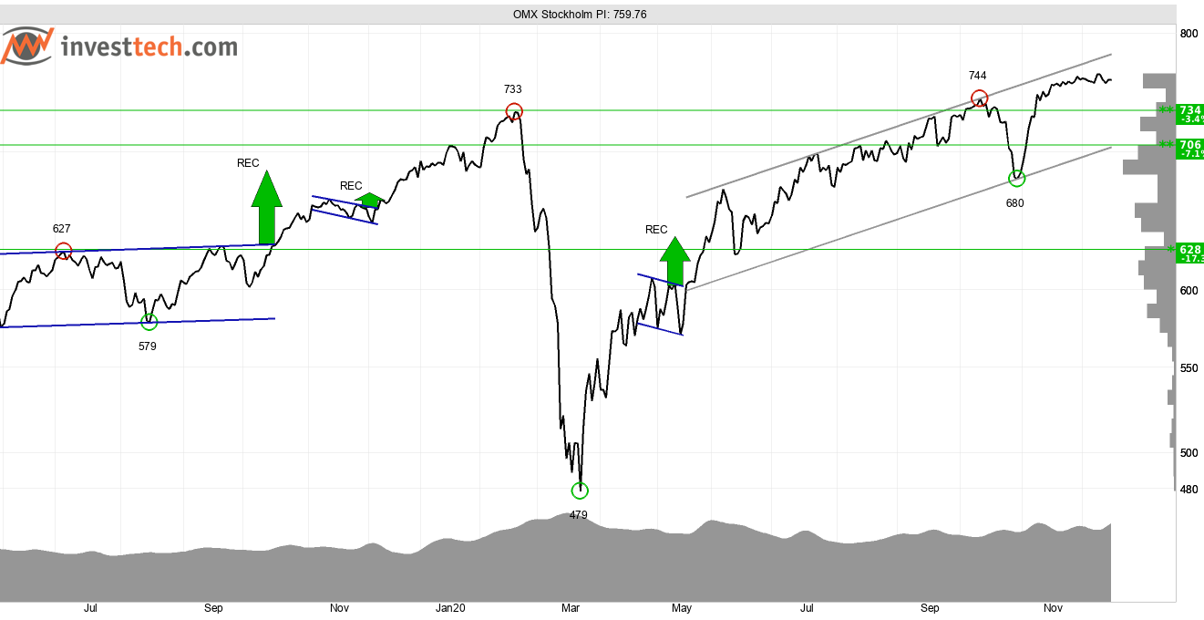 Stockholmsbörsen (OMXSPI) rörde sig sidledes under tisdagen och slutade på 760 punkter. Kursen återfinns i en stigande trend som Investtechs algoritmer har identifierat i kursdiagrammet för medellång sikt. Avsaknaden av motstånd ovanför dagens kurs är positivt för den tekniska bilden. 734-744 punkter utgör stöd vid reaktion ned.