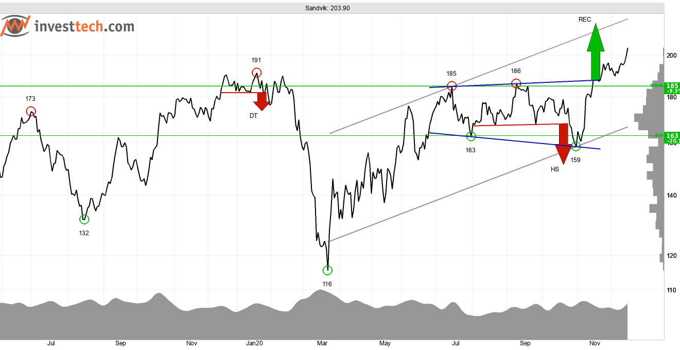 Sandvik befinner sig i en stigande trend på medellång sikt, och har utvecklats i princip horisontellt sedan i somras. Investtechs algoritmer har identifierat en rektangelformation som i stort sammanfaller med stödet vid 163 kronor och den tidigare motståndsnivån vid 186 kronor. Det senare har brutits vilket utlöst köpsignal från rektangelformation. Investtechs forskning visar att detta öppnar för statistiskt goda möjligheter till meravkastning mot referensindex. Att köpsignalen sker i stigande trend är särskilt positivt i sammanhanget. Aktien har brutit den tidigare all time high-nivån intill 196 kronor, en etablering ovanför denna är positivt för aktien. Ett RSI på närmare 70 indikerar positivt momentum vilket stärker utsikterna på kort sikt.