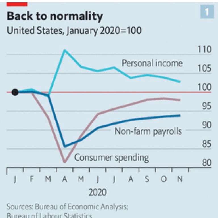Bolstering the case for a rapid rebound is the fact that economic disruption appears concentrated in certain sectors, rather than spread widely. America shed jobs, on net, in December, but only because the leisure, transport and hospitality industries were decimated by social distancing. The ratio of job openings to unemployed workers remains high and, outside of the affected sectors, wage growth has not fallen very much. The shortfall in spending is similarly concentrated. Consumer spending in the week to January 3rd was down by just 2.8% compared with a year earlier, according to Opportunity Insights, a research group. Yet retail spending on goods was 16.5% higher; it is restaurants and entertainment that are in trouble. And fiscal stimulus has more than made up the disruption to incomes in 2020. In November, the last month for which official data are available, Americans’ total after-tax income was 4.3% higher than a year earlier.