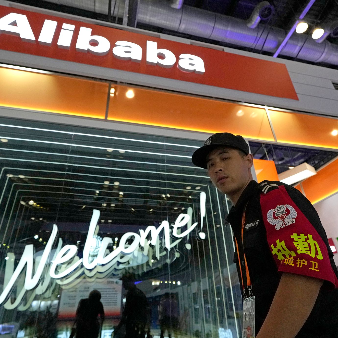 A security guard passes by the Alibaba booth at a trade show in Beijing, China, Tuesday, Sept. 7, 2021. (Ng Han Guan / AP)