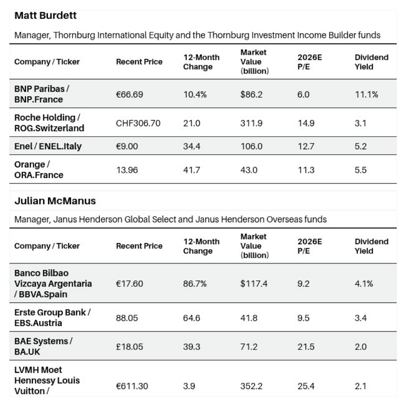 Burdett: We also own French telecom Orange, which trades at about six times enterprise value to Ebitda [earnings before interest, taxes, depreciation, and amortization]. The fourth telecom operator in the industry is struggling, so the other three—including Orange—have made an offer to buy the assets. We could get a quasi-consolidation in the market, which would help the competitive dynamic and lead to a better revenue pool.