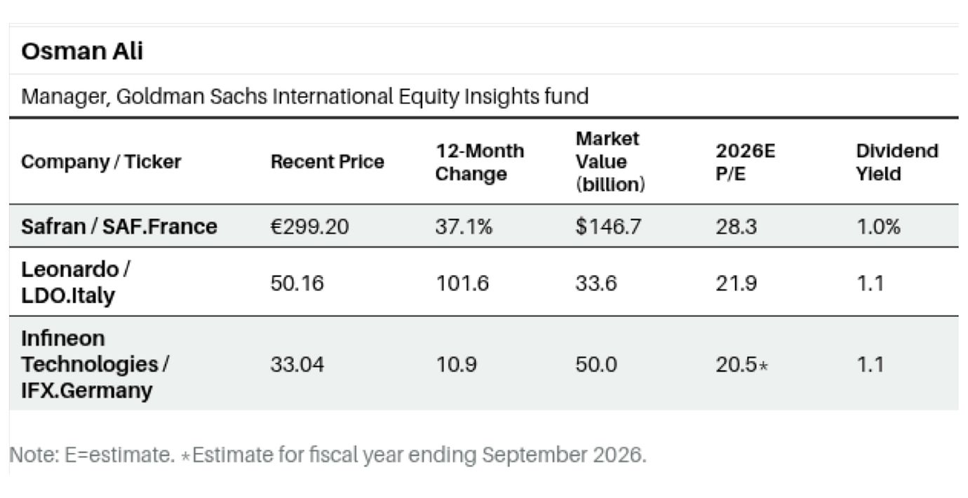 Ali: We have been overweight aerospace and defense for three-plus years, leading up to the Russian invasion of Ukraine. We were at a conviction level of three or four out of 10, playing that through Kongsberg Gruppen in Norway, Thales in France, and Rheinmetall in Germany. That is one of the things about Europe: Each country has its own play on a theme, providing a diversified set of stocks so you don’t have to bet on just one or two.