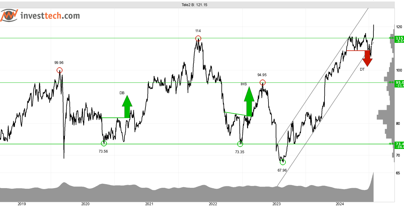 Tele2 steg på rapporten som presenterades under onsdagen. Marknaden handlade upp aktien 5,2 procent, som därmed bröt upp genom motståndet runt 115 kronor. Detta har föregåtts av en lång period av positiv utveckling för aktien. Investerarna har över tid köpt in sig till allt högre kurs vilket resulterat i en starkt stigande trend på medellång- och lång sikt (se grafen ovan). Onsdagens uppgång gör att aktien stängde på nytt all time high. Motstånd ovanför dagens kurs saknas därmed. Detta är en positiv omständighet enligt Investtechs kvantitativa forskning, och öppnar för vidare uppgång. Vid reaktion ned är 115 kronor stöd.