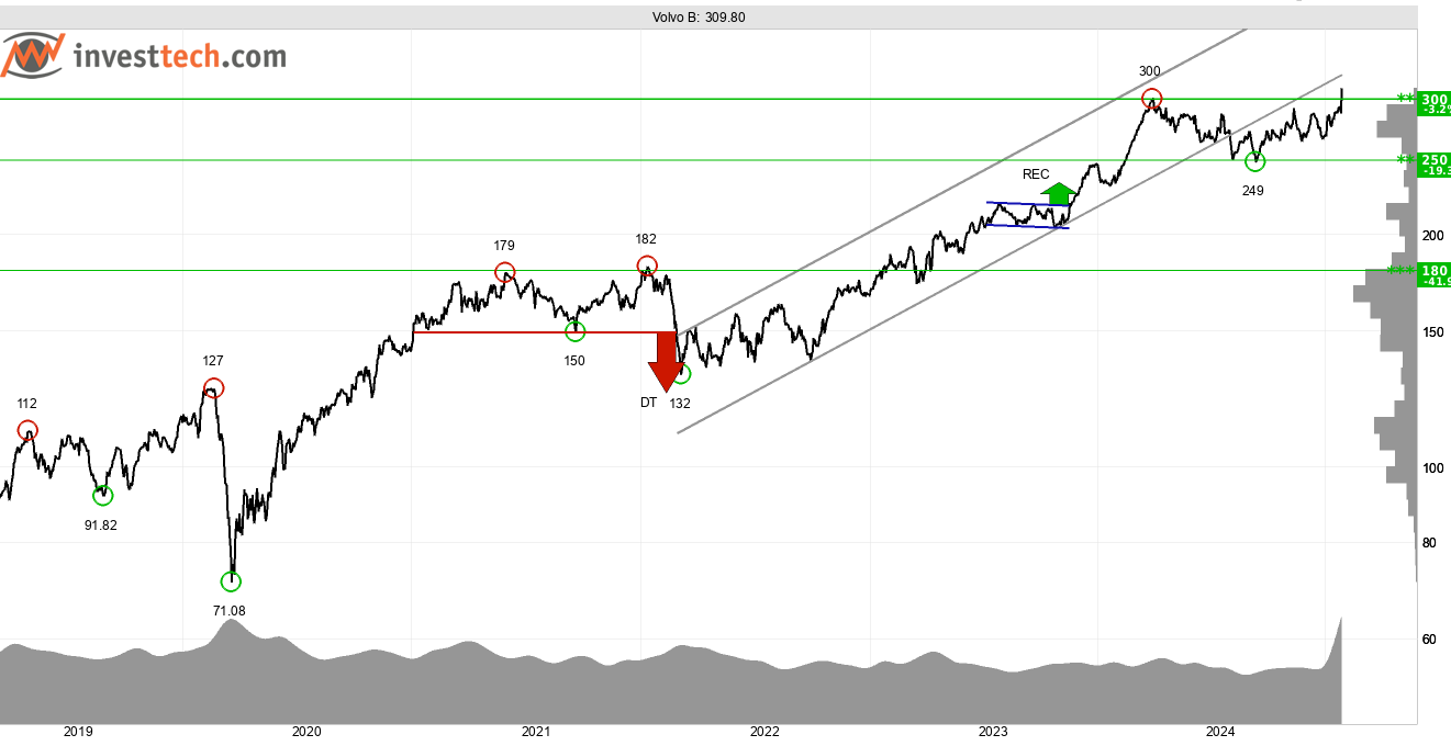 AB Volvo presenterade resultatet för 2024 under onsdagen. Marknaden handlade upp bolagets B-aktie drygt sju procent vilket gjorde att motståndet vid 300 kronor bröts. Köpsignal är därmed utlöst. Den underliggande tekniska bilden är positiv med en brant stigande trend, vars signalvärde stärks av en positiv volymbalans. Ett starkt momentum ger stöd till utsikterna på kort sikt. Vidare uppgång indikeras. Avsaknaden av motstånd ovanför dagens kurs är statistiskt gynnsamt för aktien enligt Investtechs forskning. 300 kronor är numera stöd.