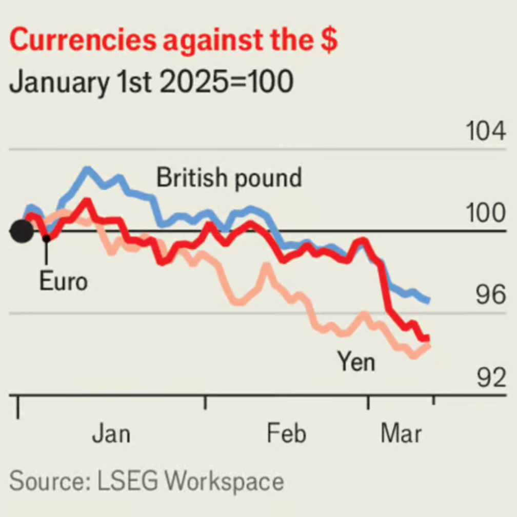 The final—and most corrosive—source of confusion is the baffling logic behind the administration’s policies. By themselves, tariffs should boost the value of the greenback, as Americans buy fewer imports and therefore less foreign currency. Although the dollar may have fallen particularly sharply against the euro because of European spending, its weakness against other major currencies points to an act of grave self-harm: that the hit to the American economy from tariffs is more than outweighing their direct impact.