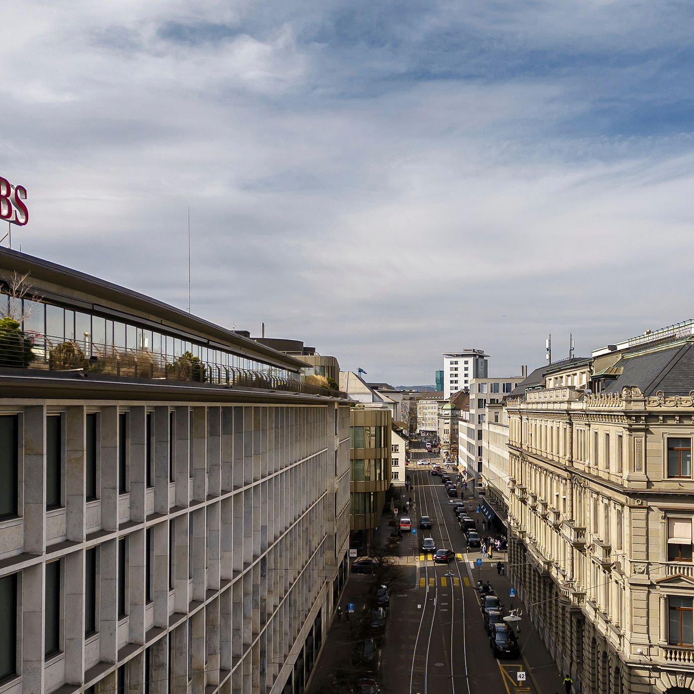 A general view shows the headquarters of the Swiss bank Credit Suisse, right, and UBS, left, at Paradeplatz in in Zurich, Switzerland, Saturday, March 18, 2023.  (Michael Buholzer / AP)