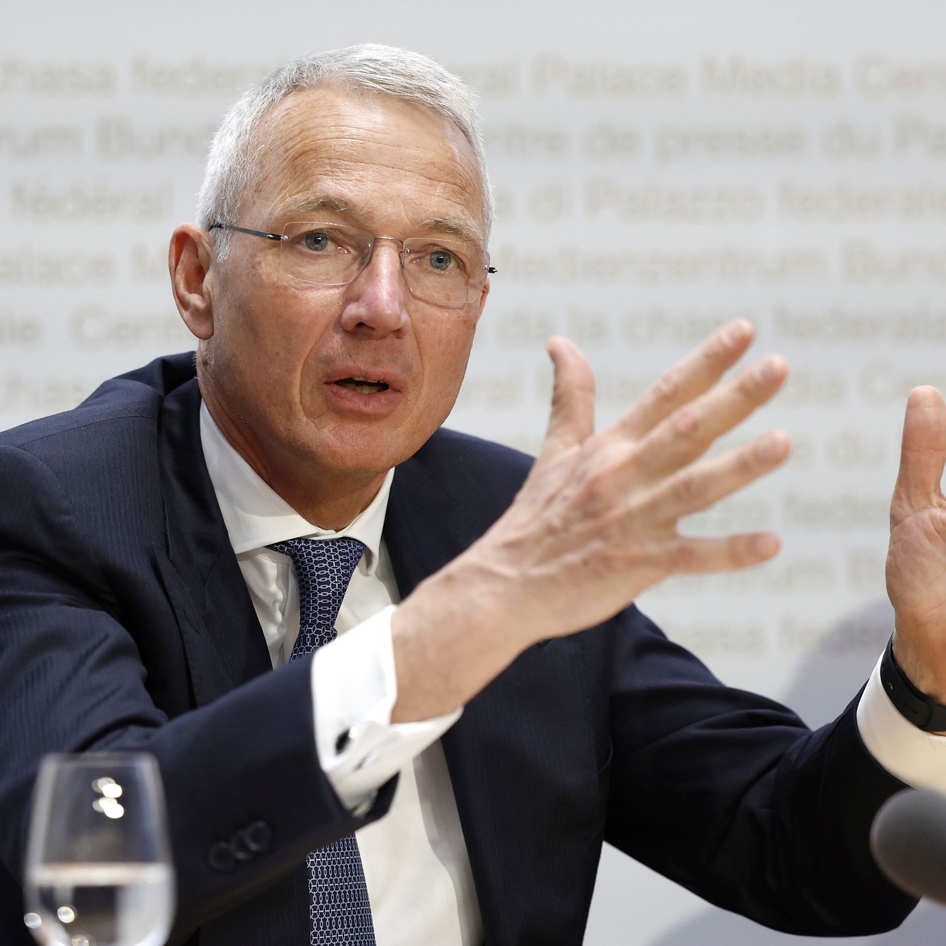 Axel Lehmann, Chairman Credit Suisse, speaks during a press conference in Bern, Switzerland, Sunday March 19, 2023. (Peter Klaunzer / AP)