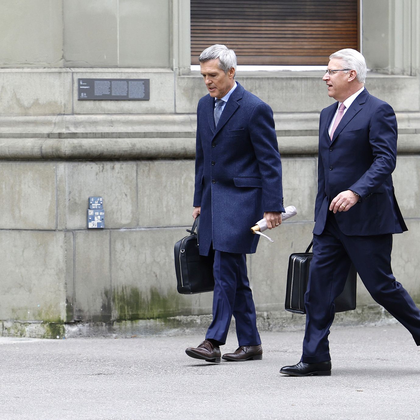 Vice Chairman of the Board of Directors UBS Group AG Lukas Gaehwiler, left, and Member of the Group Executive Board of UBS Group AG Markus Ronner walk in front of the Bernerhof, headquarters of the Federal Department of Finance FDF, in Bern, Switzerland, Sunday, March 19 2023. (Peter Klaunzer / AP)