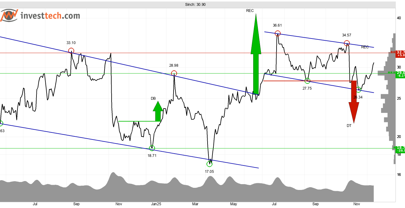 Sinch noterar en i huvudsak horisontell utveckling sedan i somras. Aktien handlas mellan stödet vid 29 kronor och motståndet vid 32,70 kronor. Brott genom det senare, och vidare genom 33 kronor skulle utlösa köpsignal från rektangelformation med potential till stor uppsida. Aktien stärks av en kurs ovanför 29 kronor, en positiv volymutveckling, och en starkt stigande trend i grafen på kort sikt. Samlat signaleras ett ökat köpintresse bland investerarna vilket öppnar för vidare press uppåt av aktiekursen.