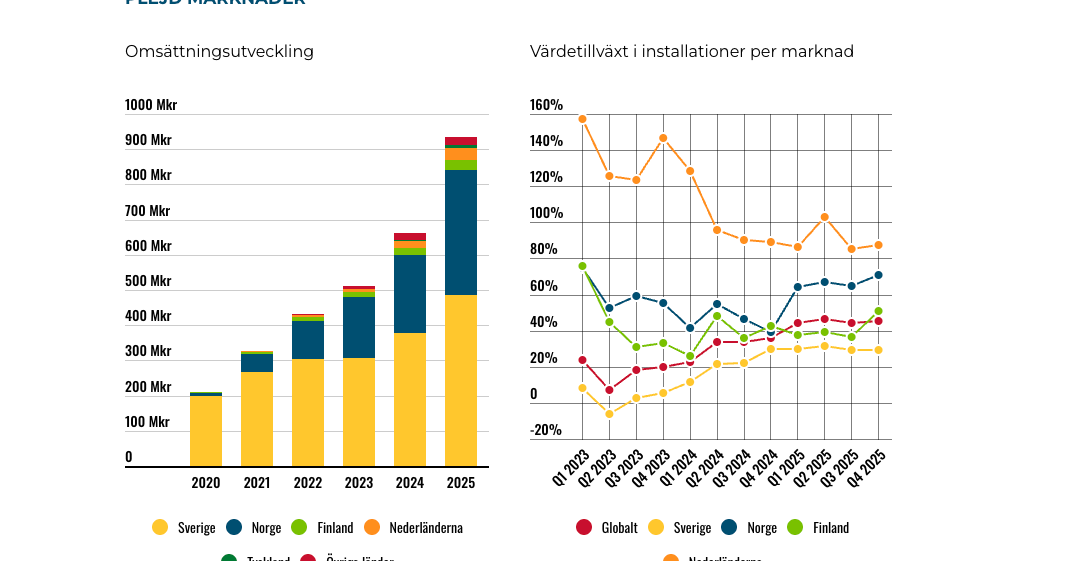 Nederländerna växer fortast procentuellt sett (kring 90%). Det är dock riktigt imponerande att Norge växer runt 70% med tanke på att Plejd redan är rätt stora där (omsatte 354 Mkr år 2025).