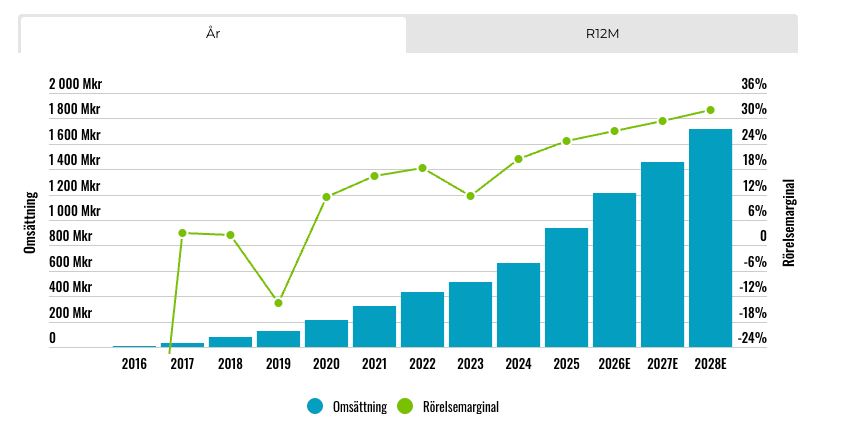 Plejd har sedan noteringen år 2016 varit ett av börsens absolut snabbast växande bolag. År 2016 omsatte Plejd cirka 5 Mkr och 2025 landade omsättningen på 935 Mkr. De senaste fem åren (2021-2025) har den genomsnittliga årliga tillväxten varit 35% per år. Otroligt imponerande.