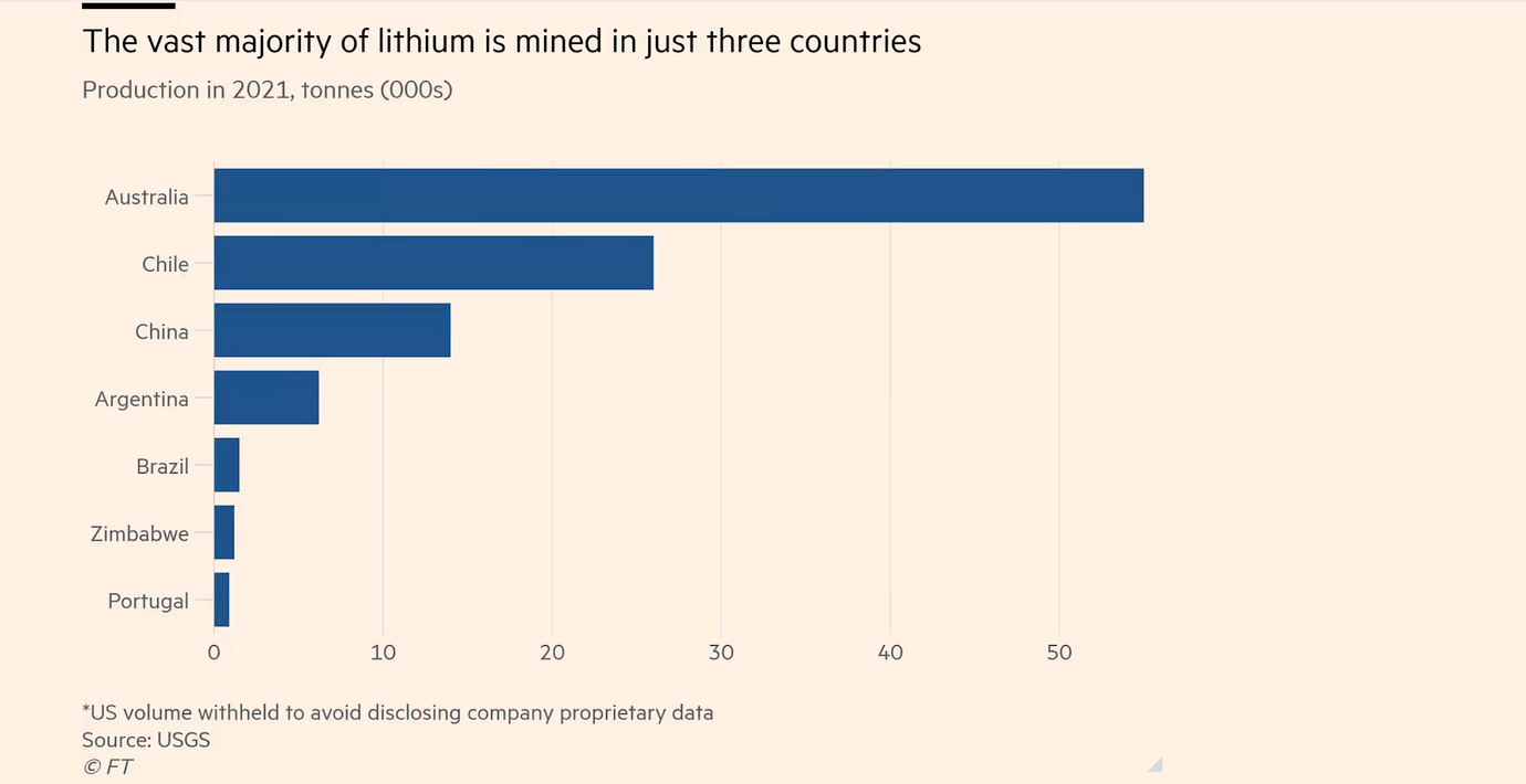 The US holds about 8mn tonnes of lithium, according to the US Geological Survey, putting it in the top five most lithium-rich countries in the world. Yet it mines and processes only 1 per cent of global output. Much of the rest comes from China, Chile and Australia.