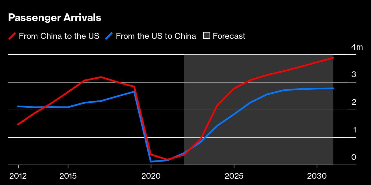 Growing demand for flights between the two countries means money will be left on the table unless some sort of accord is reached. The number of people traveling between the US and China this year is projected to hit 1.75 million, about 32% of the 5.48 million who traveled in 2019, according to Tourism Economics, which analyzes the effects of economic activity on global travel. Tourism Economics expects US-to-China passenger numbers to regain 2019 levels in 2028; travelers from China to the US will exceed the 2019 number two years earlier, in 2026.