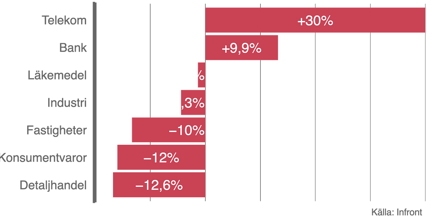 Inom detaljhandeln är det en något polariserad bild som framträder. Raketer som Clas Ohlson (+45 procent), Nelly (+67 procent) och Byggmax (+28 procent) matchas med besvikelser som H&M (-11 procent) och Bilia (-15 procent).