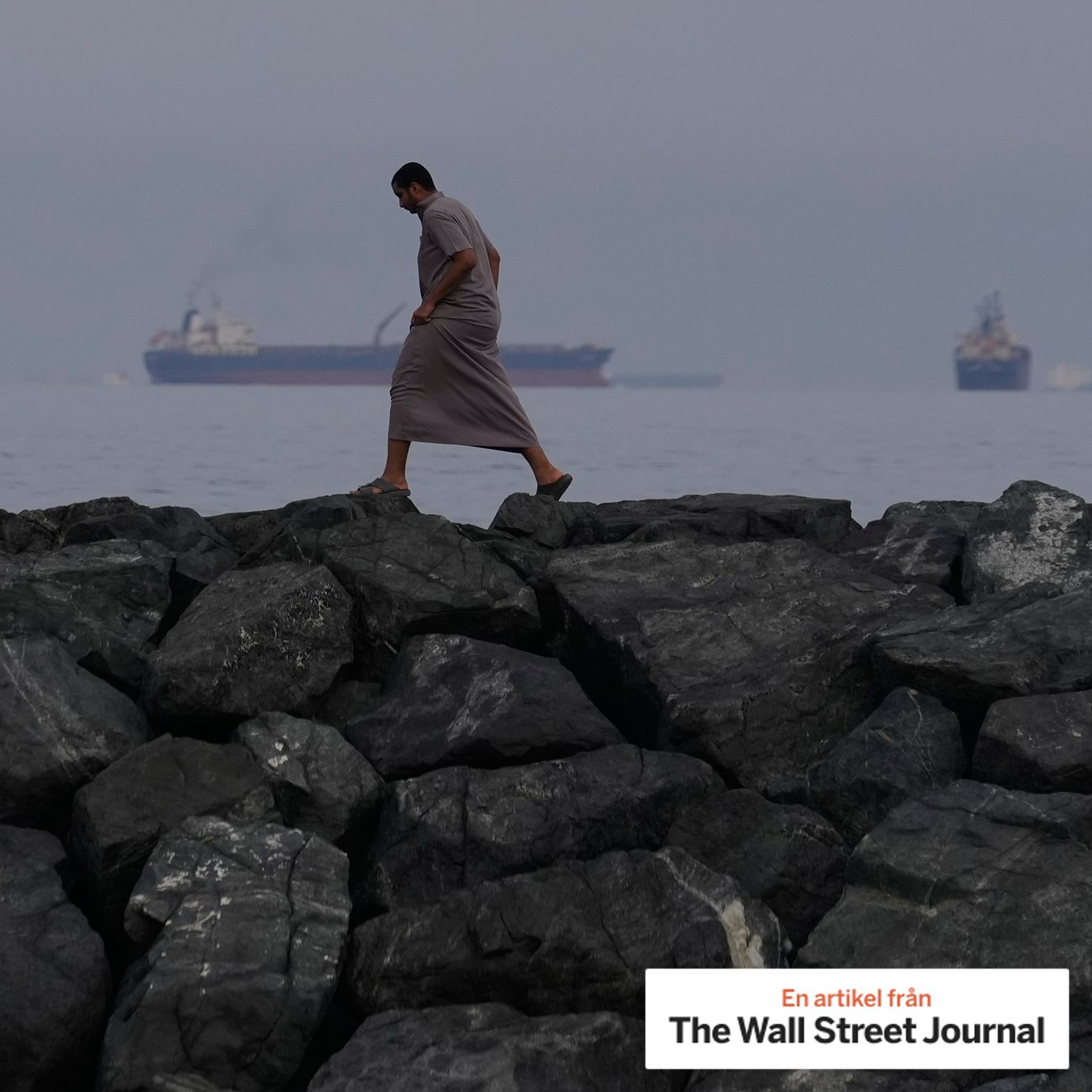 A man walks on rocks along the shore as oil tankers and cargo ships line up in the Strait of Hormuz, as seen from Khor Fakkan, United Arab Emirates, March 11, 2026 (Altaf Qadri /AP/TT / AP)