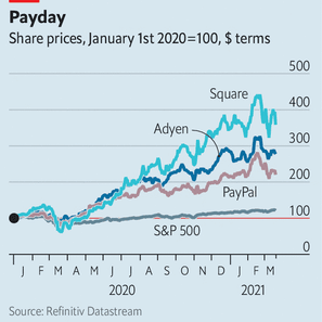 Investors’ enthusiasm for Western digital-payments companies has been whetted by the pandemic. PayPal’s share price has jumped by 180% in the past 12 months. That of Square, an American rival, has more than quintupled; and that of Adyen, based in Amsterdam, has nearly tripled. The digital boom is luring credit-card colossuses and tech titans, such as Visa and Google, to online payments. Smaller startups, meanwhile, are carving out niches. Yet markets still love the four specialists: PayPal’s shares trade at 68 times earnings; Square’s, near 510. Why are investors so bullish?