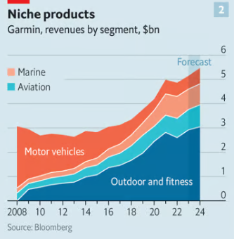 George Livadas of Upslope Capital, an investment firm, believes that Garmin is one of the few companies that has created a premium brand in a market with an available Apple alternative. Today its total annual revenues of almost $5bn are roughly twice what they were when the first Apple Watch hit the shelves. Smartwatches and fitness trackers contribute almost 60% of the firm’s sales (with most of the rest coming from professional navigation systems for ships and aircraft, see chart 2).