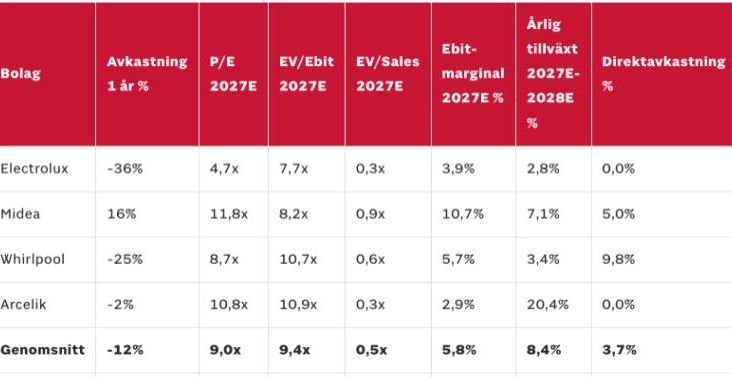 Ingen USA-ljusning syns alls i Q1 2026. I kvartalet har Nordamerika -868 Mkr (-337) i Ebit och intäkterna faller 12% till 7,0 mdr kr på en marknad där volymen rasade 10% (värsta tappet på 10 år). Electrolux behöver göra prishöjningar på 5-20% under april för att kompensera sig för nya tullrelaterade kostnadsökningar. Utsikterna drogs ned till negativa för 2026.