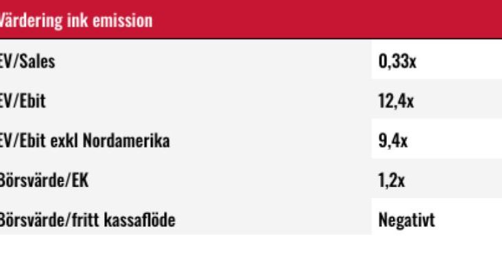 Värderingen av Electrolux ligger omkring 12x rörelseresultatet. Siffran höjs av att Nordamerika går med kraftig förlust. För aktiens del räcker det dock inte att bara ”bli av med” USA (vilket kanske JV-lösningen är första steget mot?). Värderingen inklusive nyemissionen skulle ligga på drygt EV/Ebit 9x, vilket är ganska normalt för branschen.