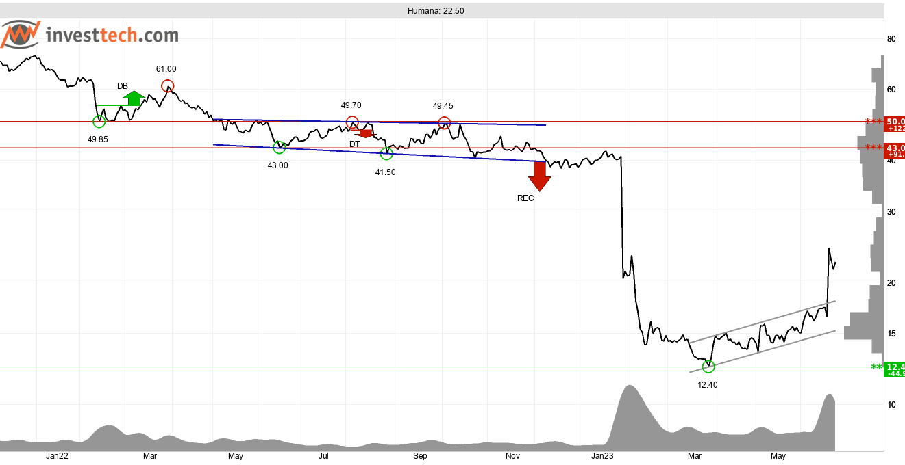 Humana är neutral på Investtechs insideranalys och aktien är totalt sett tekniskt positiv på en medellång investeringshorisont (1-6 månader). Observera att risken i aktien är hög till följd av en volatilitet på månadsbasis på drygt 26 procent.