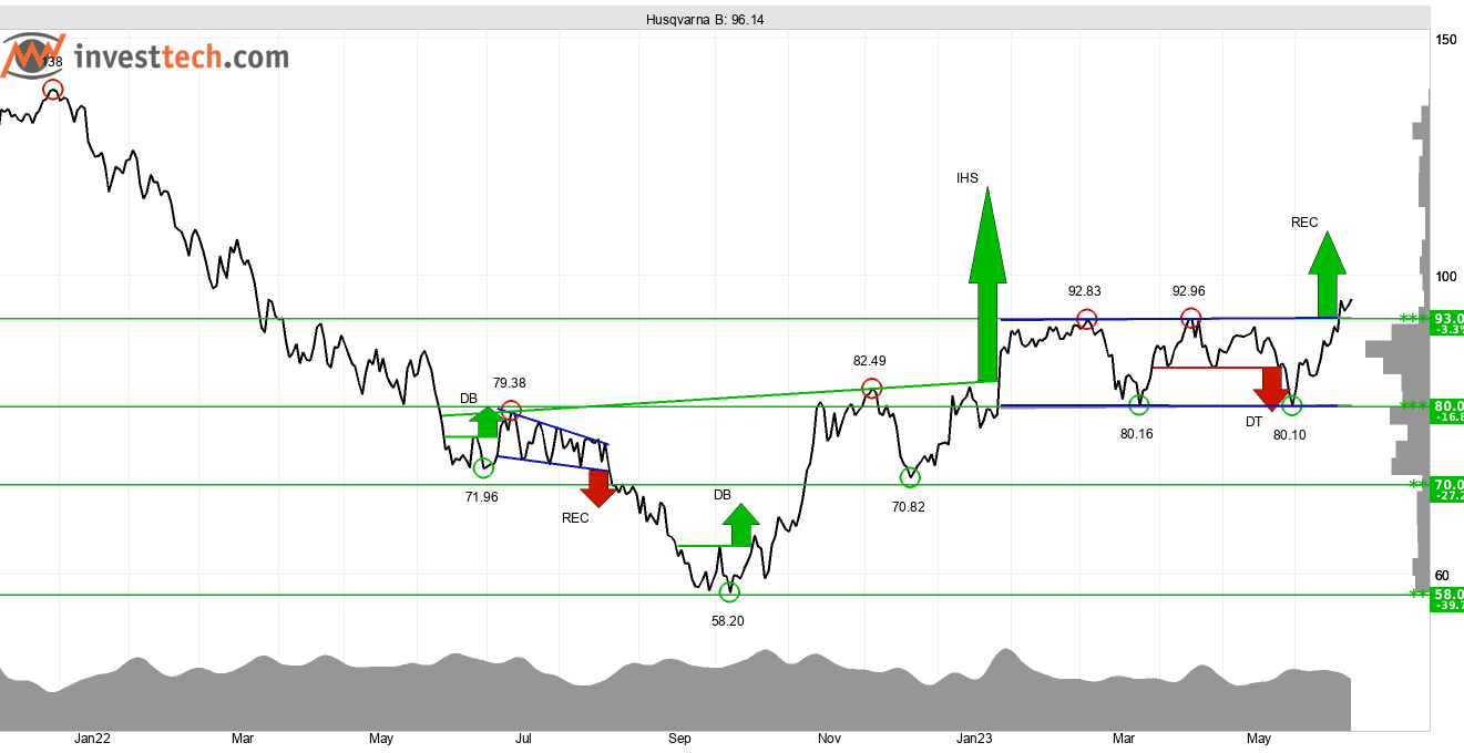 Husqvarna är en av de ledande aktörerna inom bland annat kaputrustning, motorsågar och gräsklippare. Bolagets B-aktie har fått köpsignal från rektangelformation efter att ha brutit upp genom motståndet vid 93 kronor. Brottet signalerar om en positiv optimisminjektion bland investerarna som tidigare ansett aktien vara dyr kring 93 kronor. Närheten till 93 kronor som numer är stöd gör dock att robustheten i köpsignalen kan anses begränsad. En etablering ovanför denna nivå skulle stärka caset ytterligare. Motstånd finns vid 120 kronor.