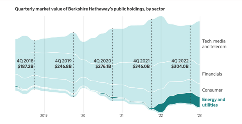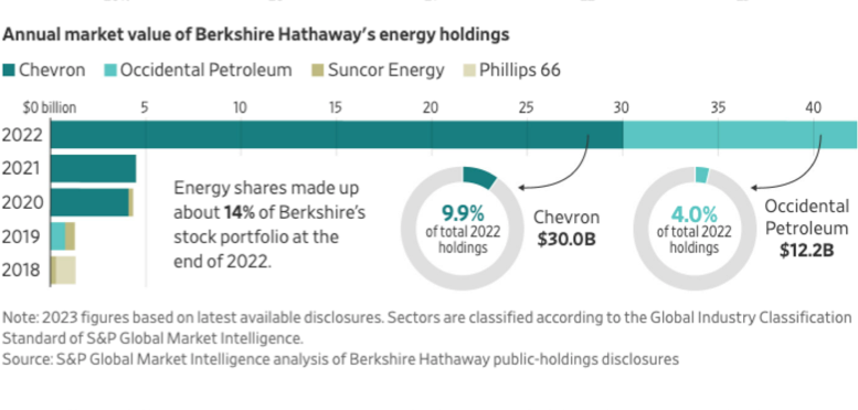 After a flurry of investments over the past year, Berkshire has become both Occidental and Chevron’s biggest shareholder. Energy shares made up about 14% of Berkshire’s stock portfolio at the end of 2022—the highest share going back to at least 2000, according to an analysis of company filings.